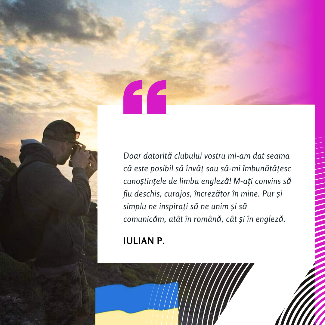 Despre Club: Am observat că majoritatea platformelor pentru învățarea limbii engleze dedicate românilor sunt de slabă calitate: suportul de curs este unul standard, pronunția profesorilor este deficitară, se folosesc aceleași metode clasice peste tot. Noi am decis să creăm un spațiu în care procesul de învățare să fie atractiv pentru studenți de toate vârstele, principiile de învățare să fie moderne și incluzive, un loc în care cursanții să simtă că fac parte dintr-o comunitate, nu dintr-o clasă cu elevi. Ne-am dorit să eliminăm bariera dintre studenți și profesor. Mai mult, am căutat o modalitate de a face cursurile accesibile tuturor.
