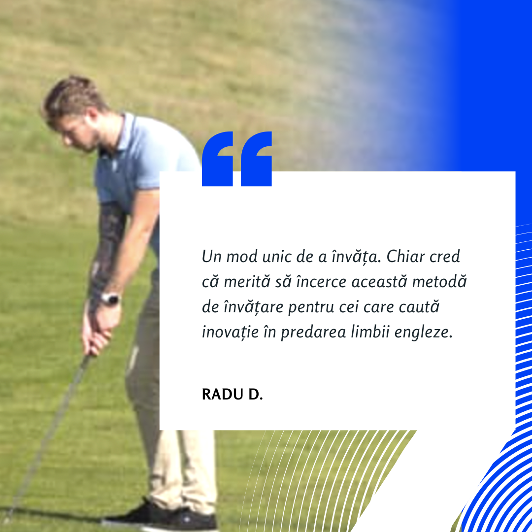 La Clubul de Engleză Online, învățăm într-un mod diferit. Nu există reguli stricte de când sau cum trebuie să înveți limba engleză. Poți alege și învăța doar subiectele care îți plac sau de care ai nevoie. Poți începe cu gramatica sau verbe neregulate, poți chiar învăța ascultând și analizând melodii – cel mai important lucru este că noi te încurajăm și ajutăm să-ți atingi scopul.