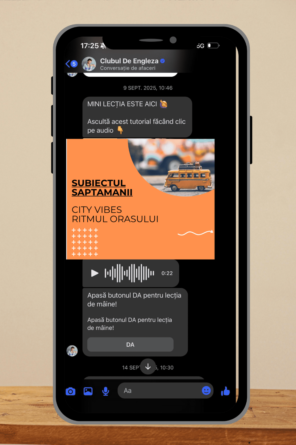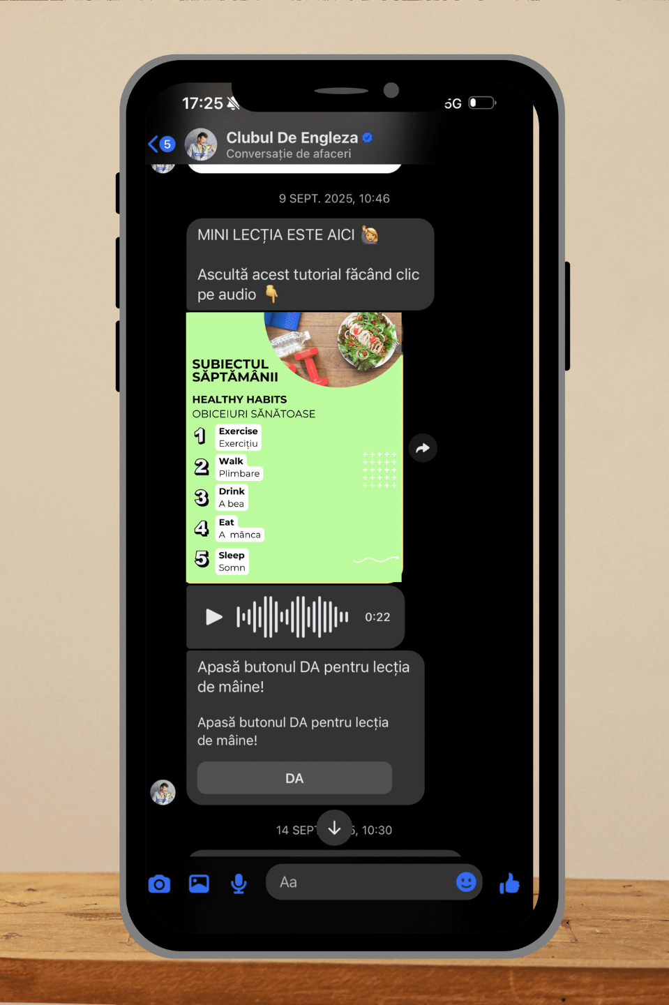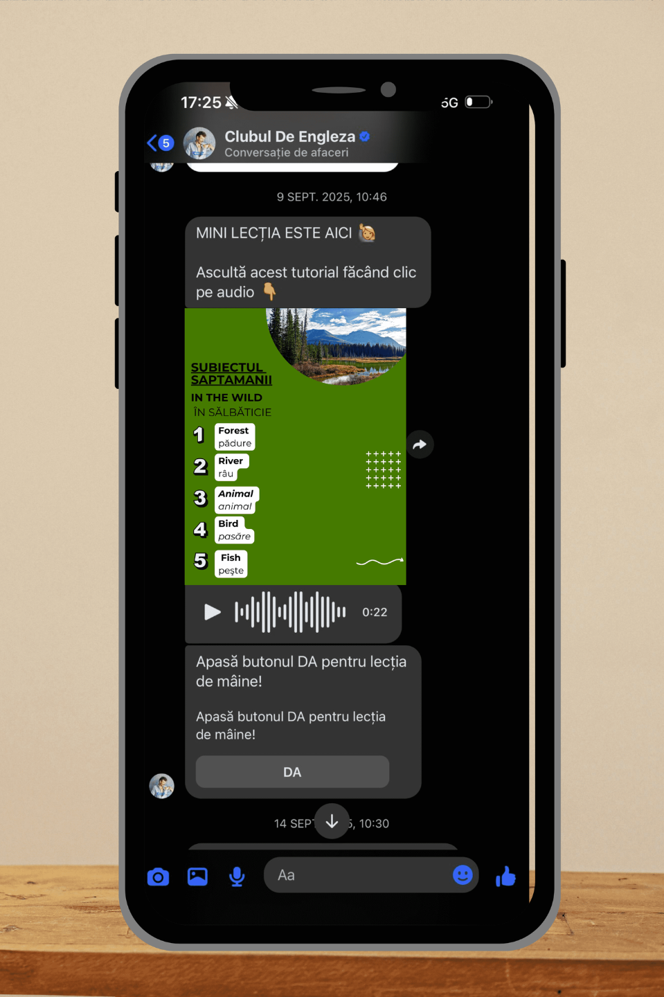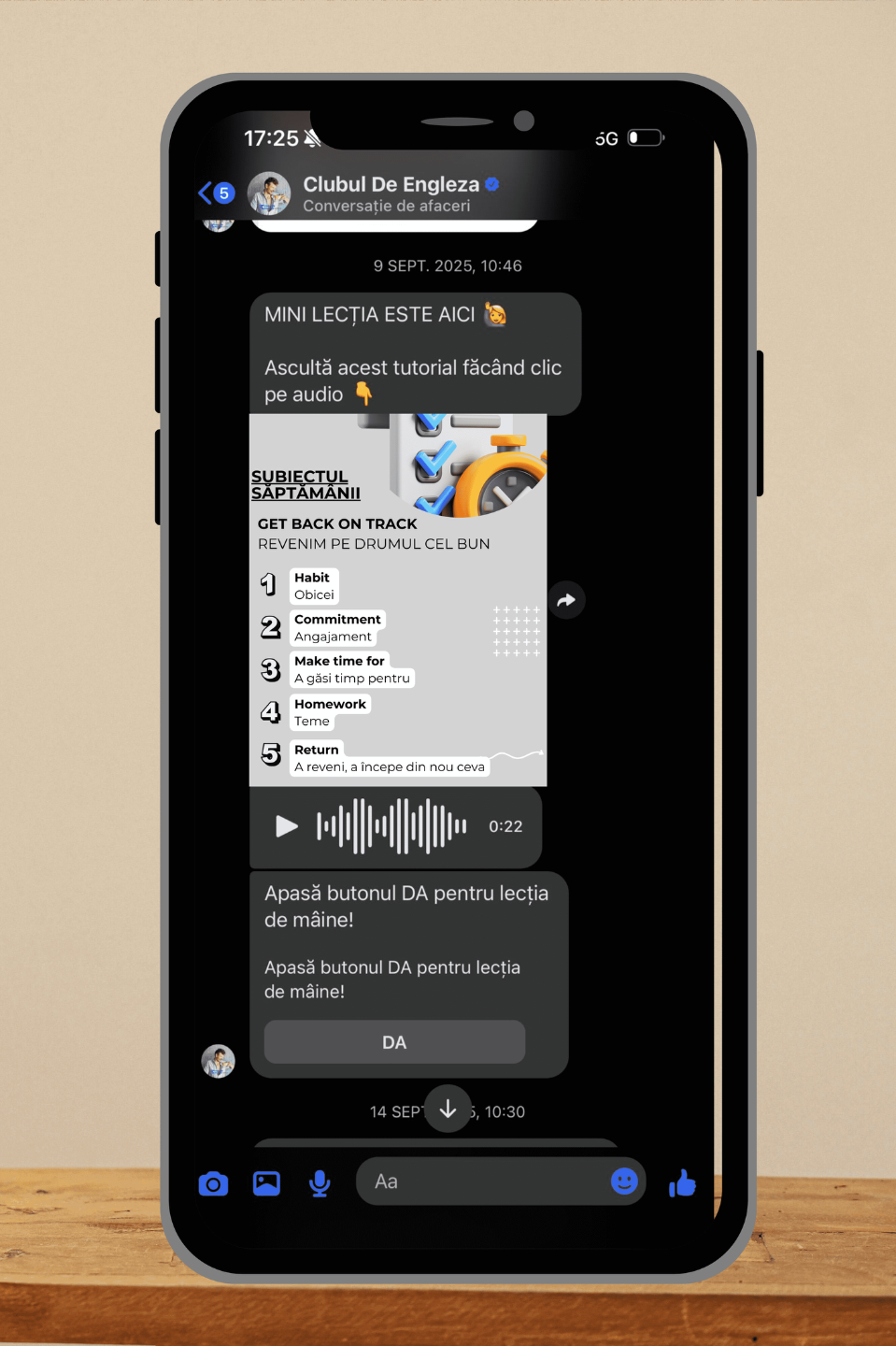 Metoda se bazează pe principiul micro-obiceiurilor – rutine mici, repetate zilnic, care generează cele mai mari schimbări pe termen lung. În loc să petreci ore întregi cu manualele, primești un scurt audio de 1 minut prin Messenger. Creierul se obișnuiește cu „doze” mici, obiceiul se formează automat, iar rezultatele se acumulează zi după zi. Este o metodă simplă, dar puternică, prin care în sfârșit poți integra limba engleză în rutina ta zilnică.
