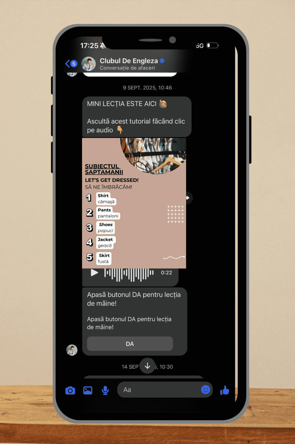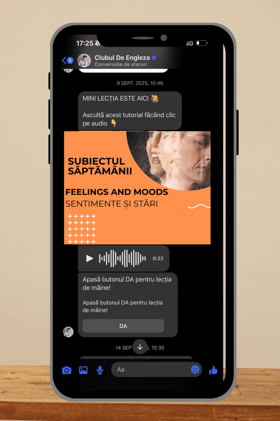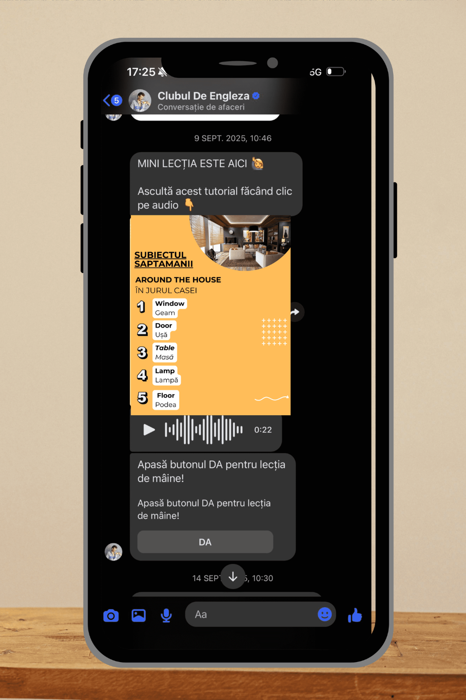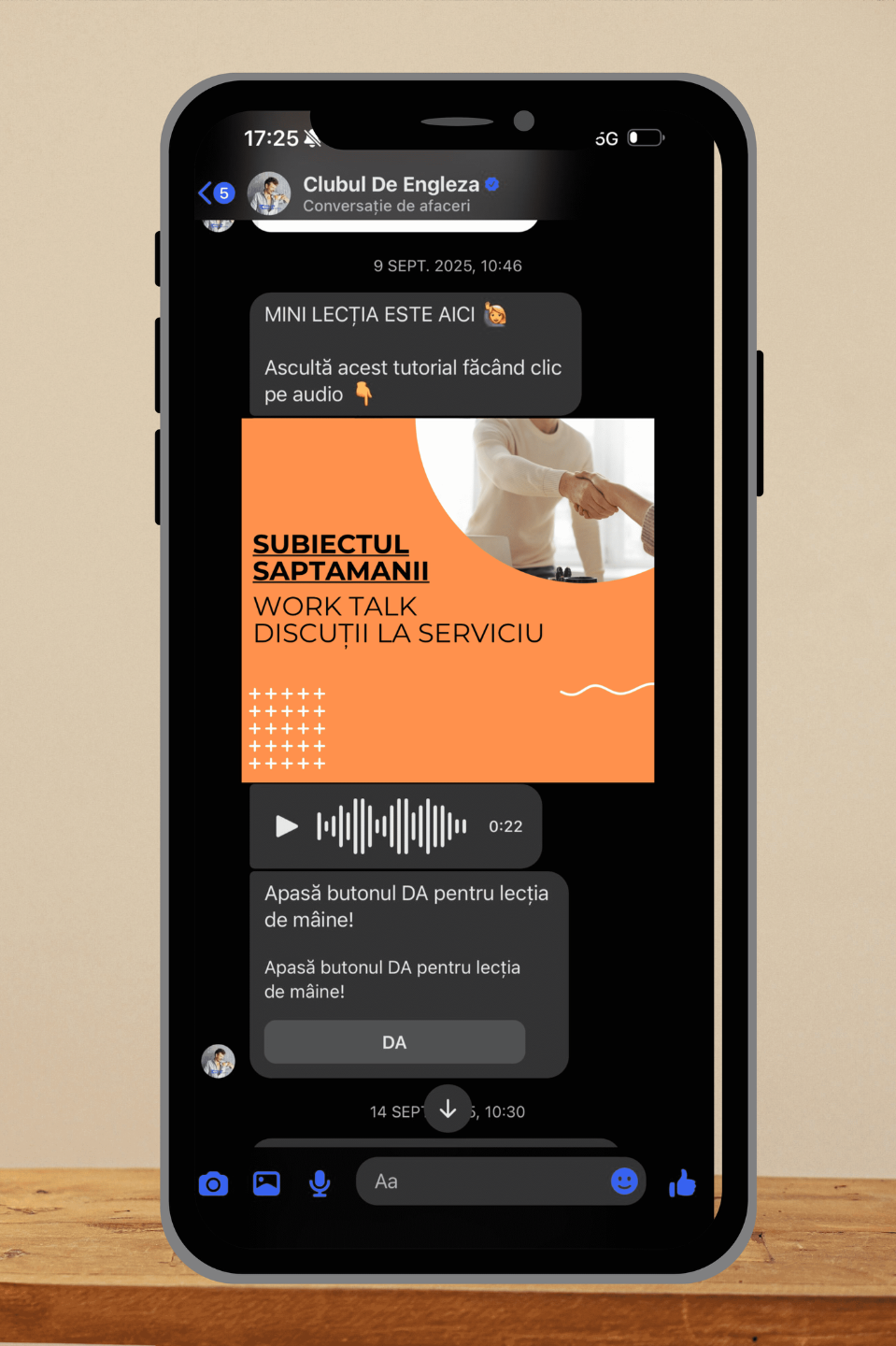 Metoda se bazează pe principiul micro-obiceiurilor – rutine mici, repetate zilnic, care generează cele mai mari schimbări pe termen lung. În loc să petreci ore întregi cu manualele, primești un scurt audio de 1 minut prin Messenger. Creierul se obișnuiește cu „doze” mici, obiceiul se formează automat, iar rezultatele se acumulează zi după zi. Este o metodă simplă, dar puternică, prin care în sfârșit poți integra limba engleză în rutina ta zilnică.