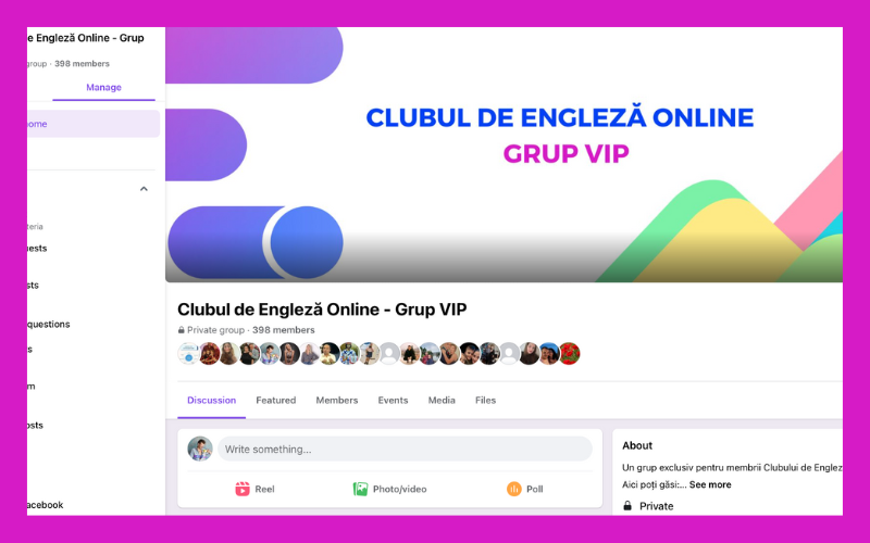 Ai nevoie de comunicare! Primul pas e să te alături unei comunități de peste 1600 de membri care îți împărtășesc dorința - să învețe limba engleză. Toți acești cursanți învață, comunică, îndeplinesc sarcini și împărtășesc realizări sau dificultăți într-un grup privat VIP, astfel motivându-se reciproc.