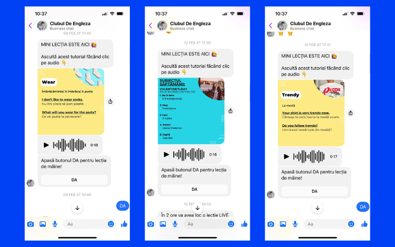 Toată lumea are nevoie de un obicei, indiferent de tipul de personalitate. Lecțiile zilnice pe Messenger, direct pe telefonul tău, te pot ajuta să-ți dezvolți un astfel de obicei. În plus, este modul perfect de a integra engleza în activitățile tale zilnice. Fiecare săptămână vine cu un nou subiect și 7 lecții - îți îmbunătățești vocabularul, pronunția și gramatica într-un mod distractiv și interesant.